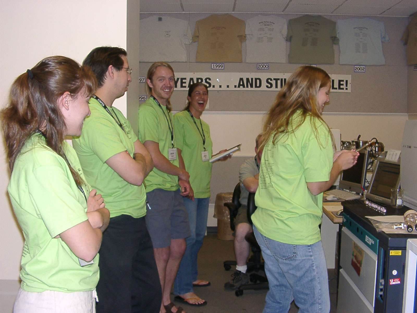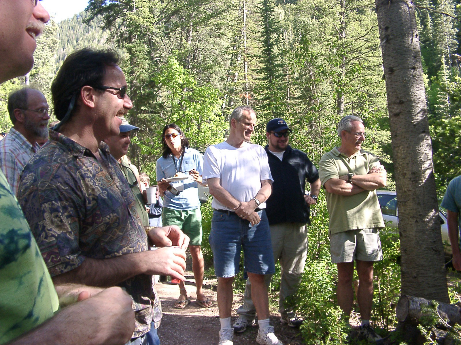 These are the so-called "IsoPopes" for the class. Currently, we are still "isotopeteers". You can see (L-R) John Roden's mustache, Howie Spero, Thure Cerling (behind Howie on the left), Dave Evan's hat, a student named Kevin (still an isotopeteer), Rolf Seigwolf, a student named Chad (isotopeteer), Todd Dawson and finally Brian Popp's shirt on the right. |