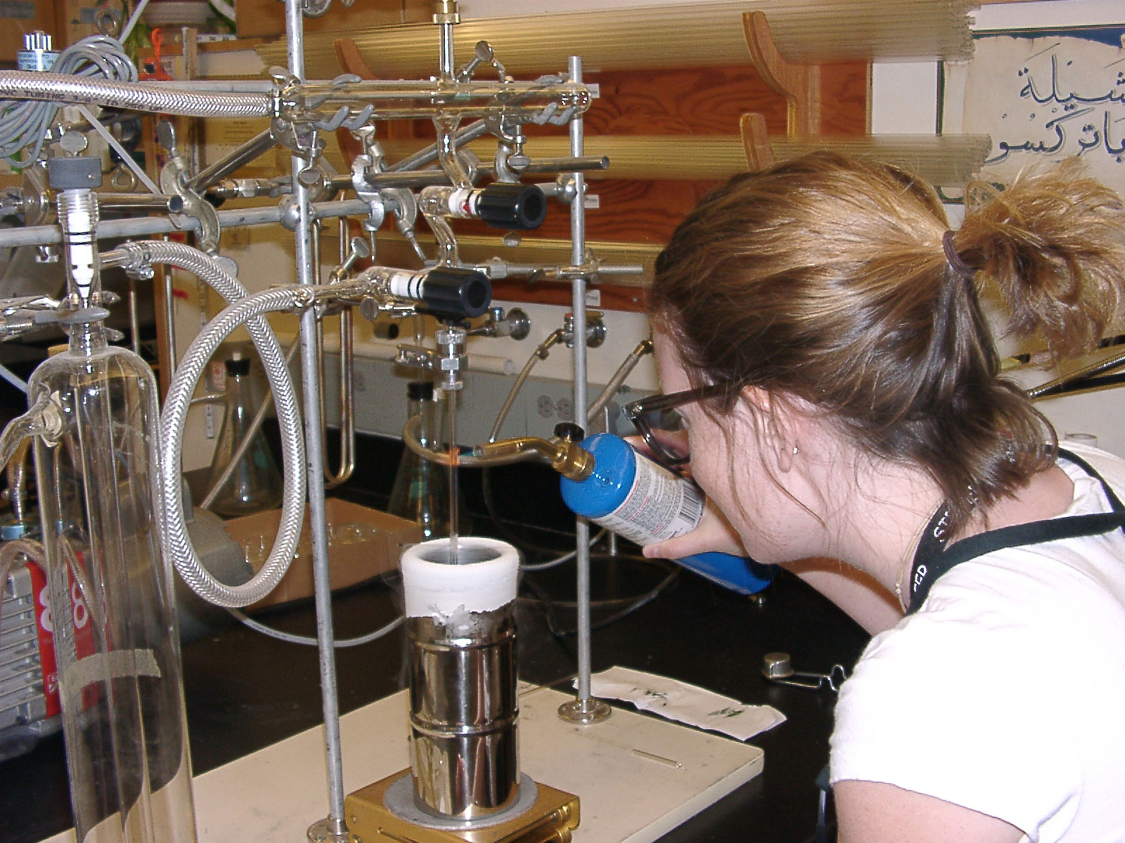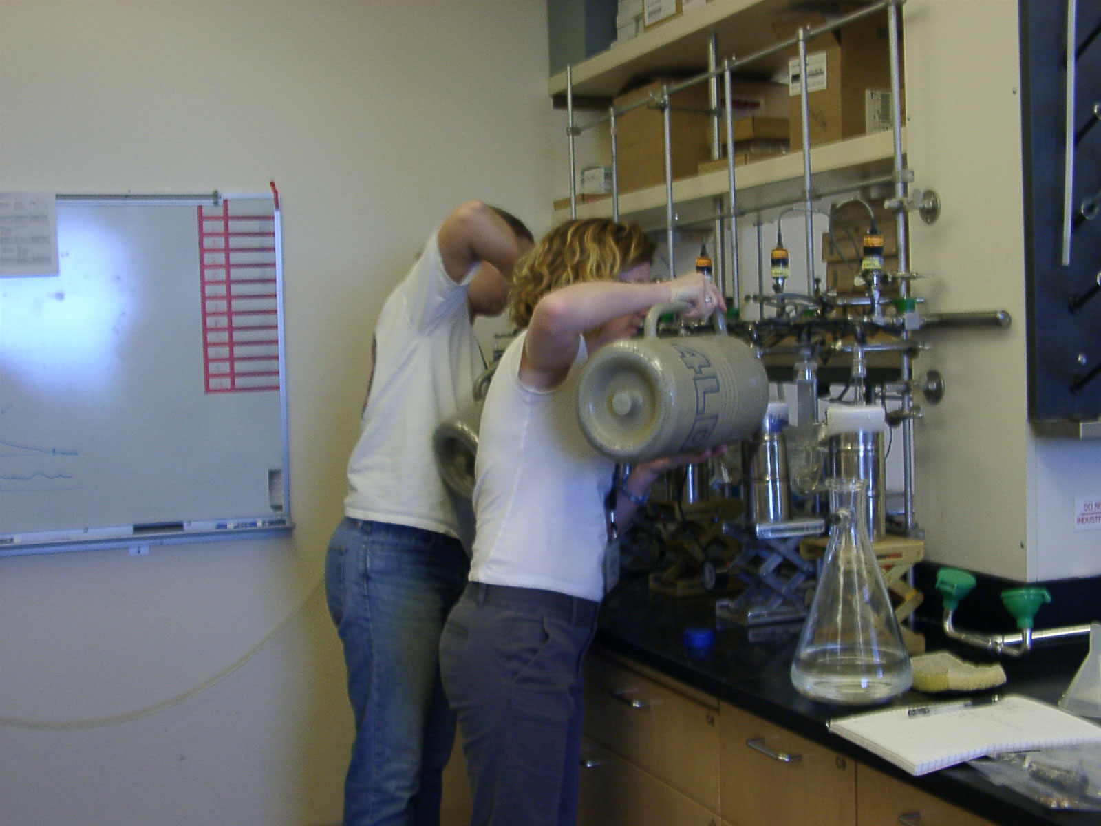 Filling the dewars with liquid nitrogen on our water extraction line. Here we were extracting water for hydrogen analysis on some insects we collected in the field. Next to me is Leslie Babonis, a grad student from Florida, she's working with water regulation in marine snakes. This water extraction line has six samples going on each side, all hooked up to vacuum. by freezing the sample first, then heating it and freezing the extraction tube, the water leaves the sample, travels through U-shaped tube and then condenses and freezes in the extraction tube. When its done you have a vial of all the water that was in the sample (in our case, insects.) |
