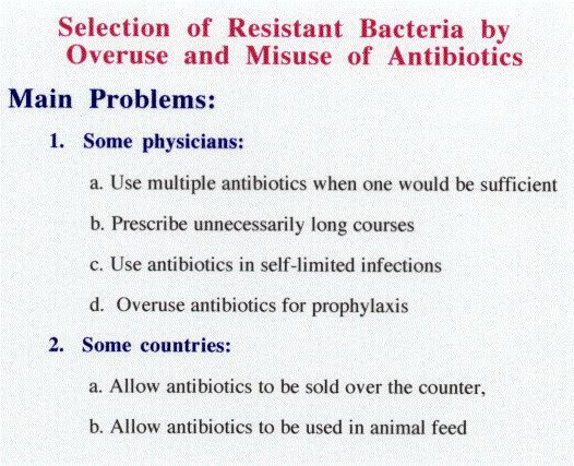 2. In many countries antibiotics are sold over the counter to the general public - this encourges inappropriate and indiscriminant use of the drugs