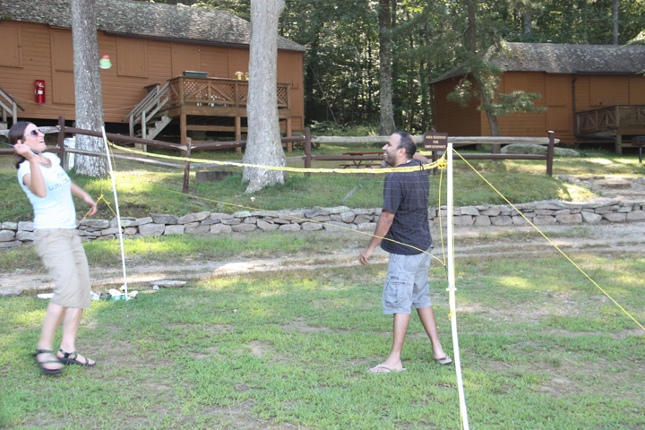 Allison H. and Rahul R. hit the shuttlecock at each other.