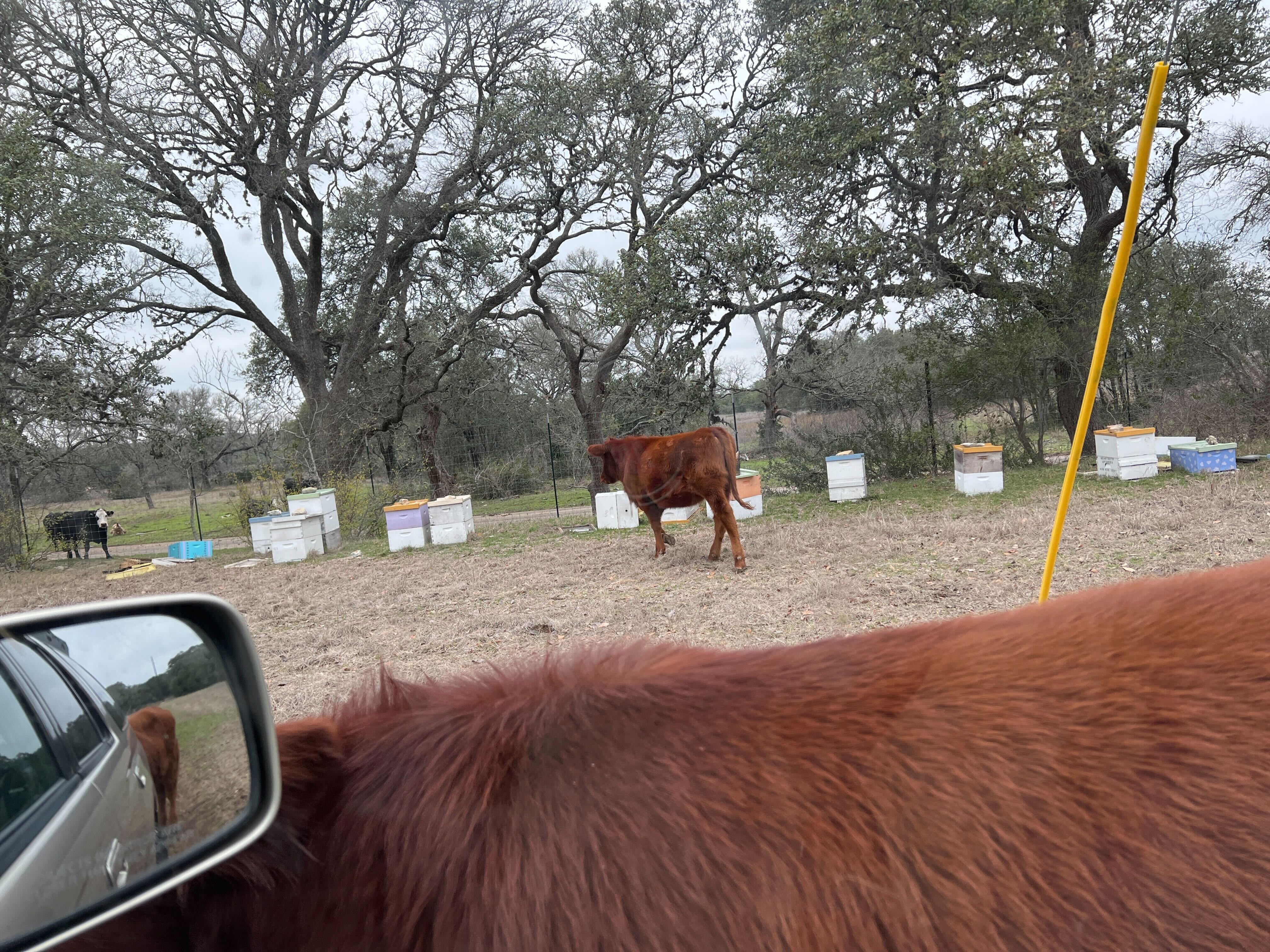 ![]() Cows greet Eli's car at Driftwood. (January 2023) |