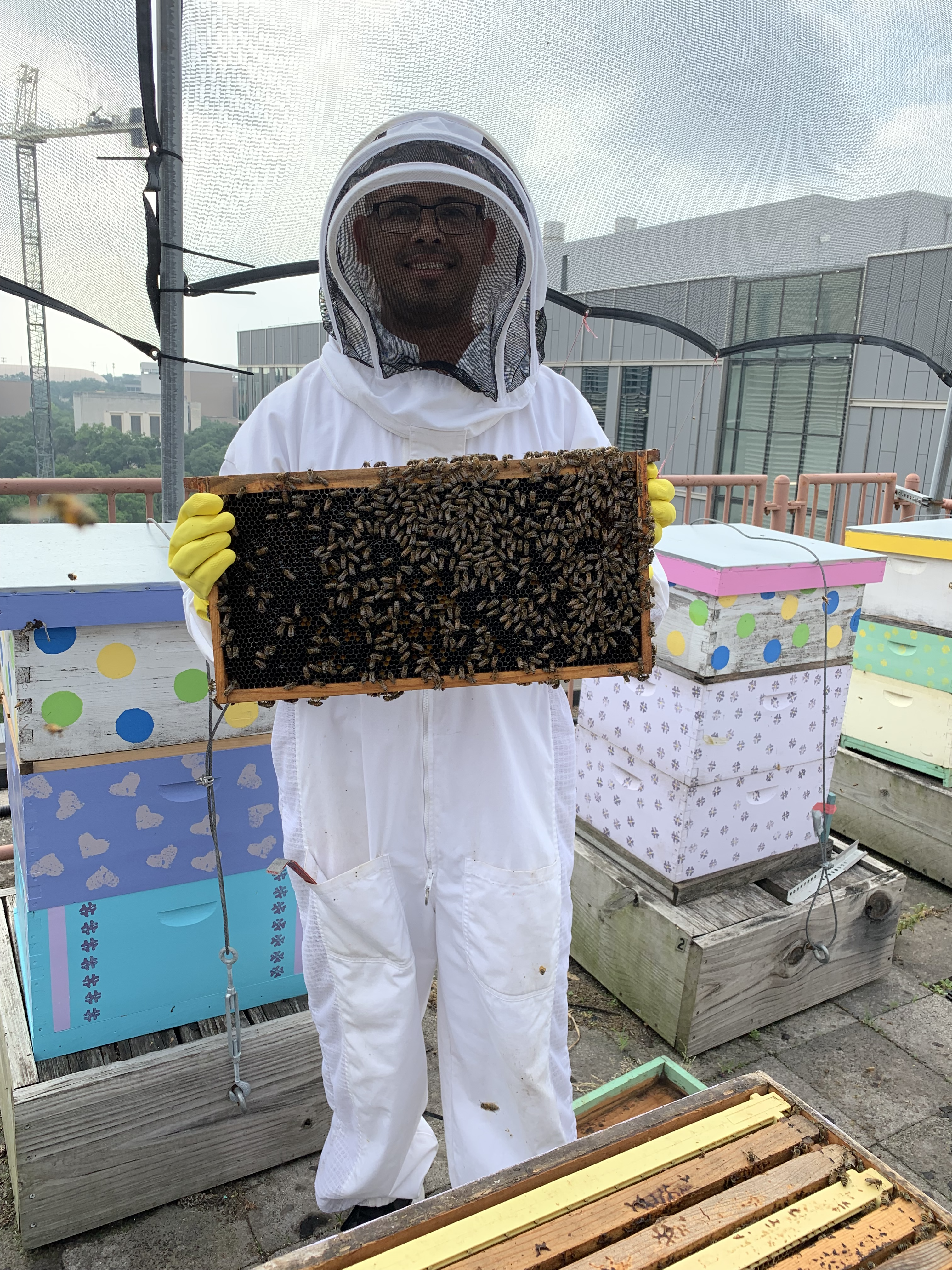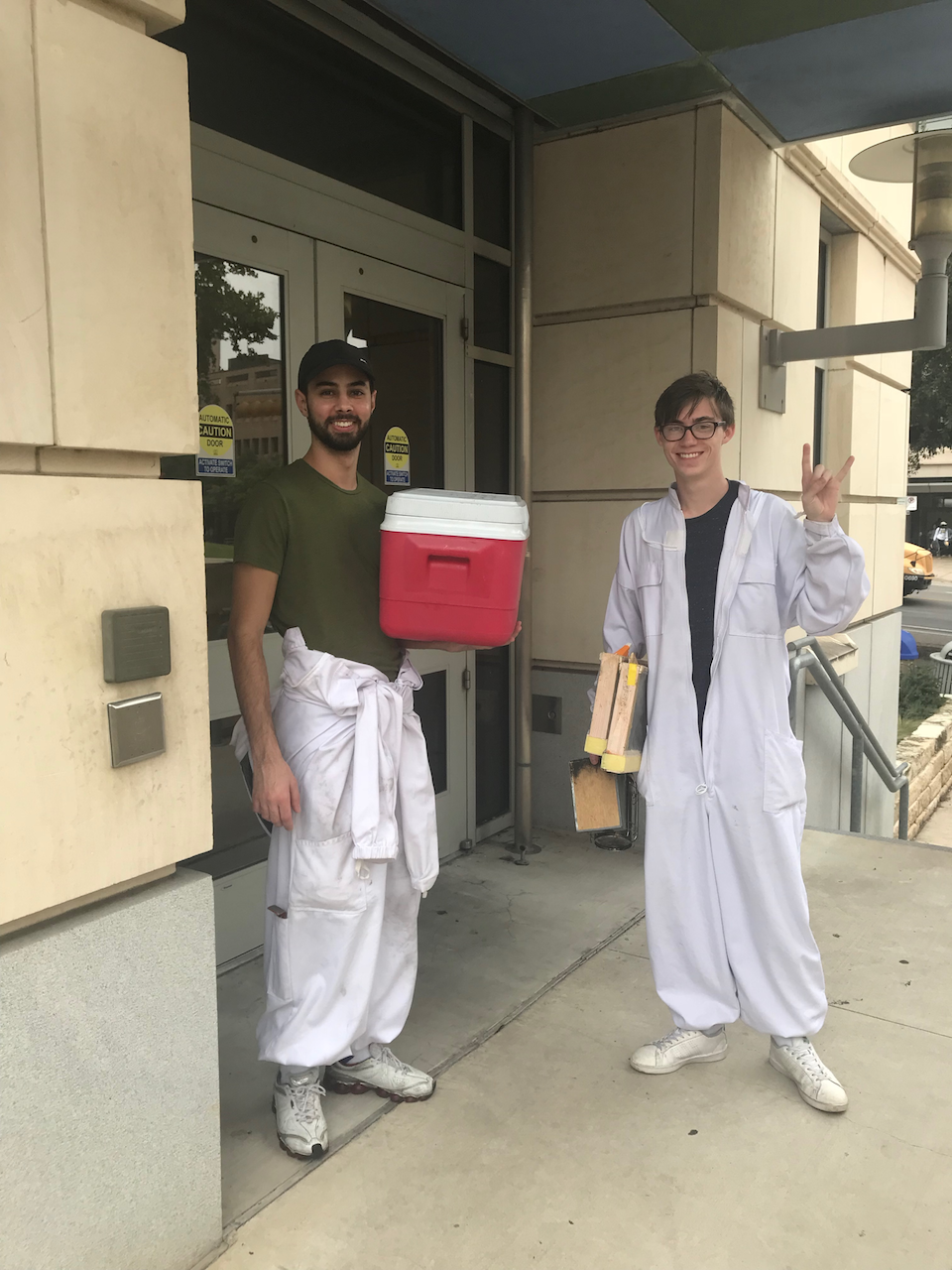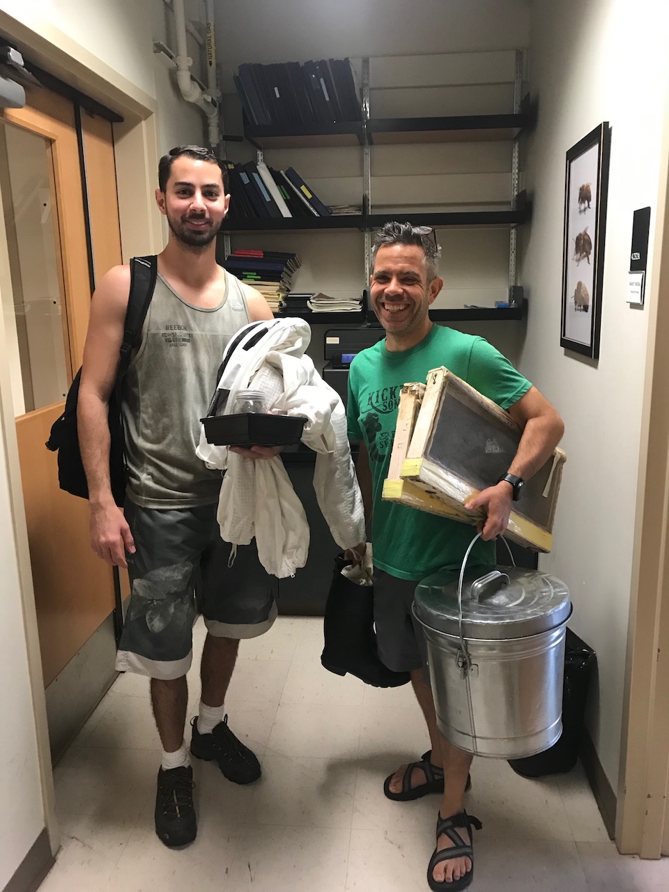 Erick d.S.M. and Tyler d.J. back from the rooftop hives (July 2019) |