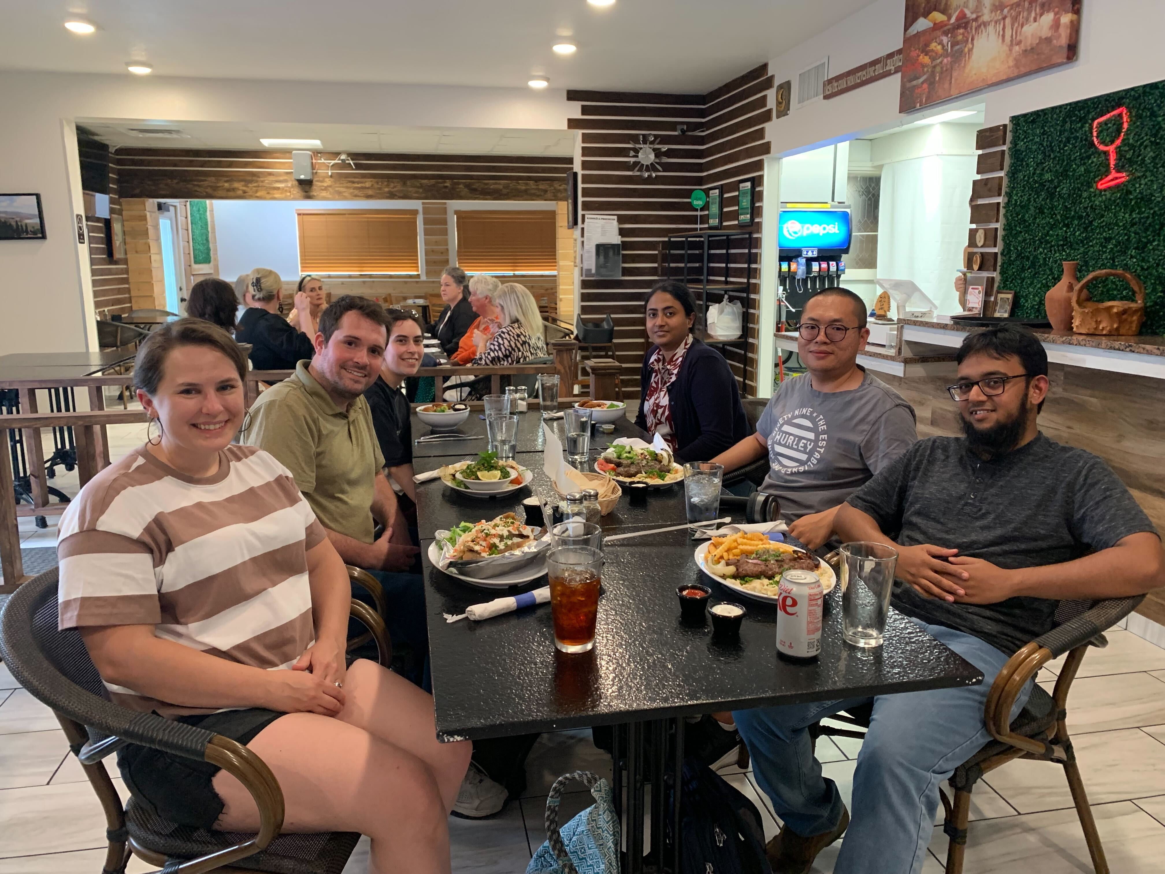 Dinner with a Ghost-doc (L to R) Sam Z., Jamie A., Angela O'D, Kiran G., Z. Li, and Hassan u-Z (June 2023 ) |
