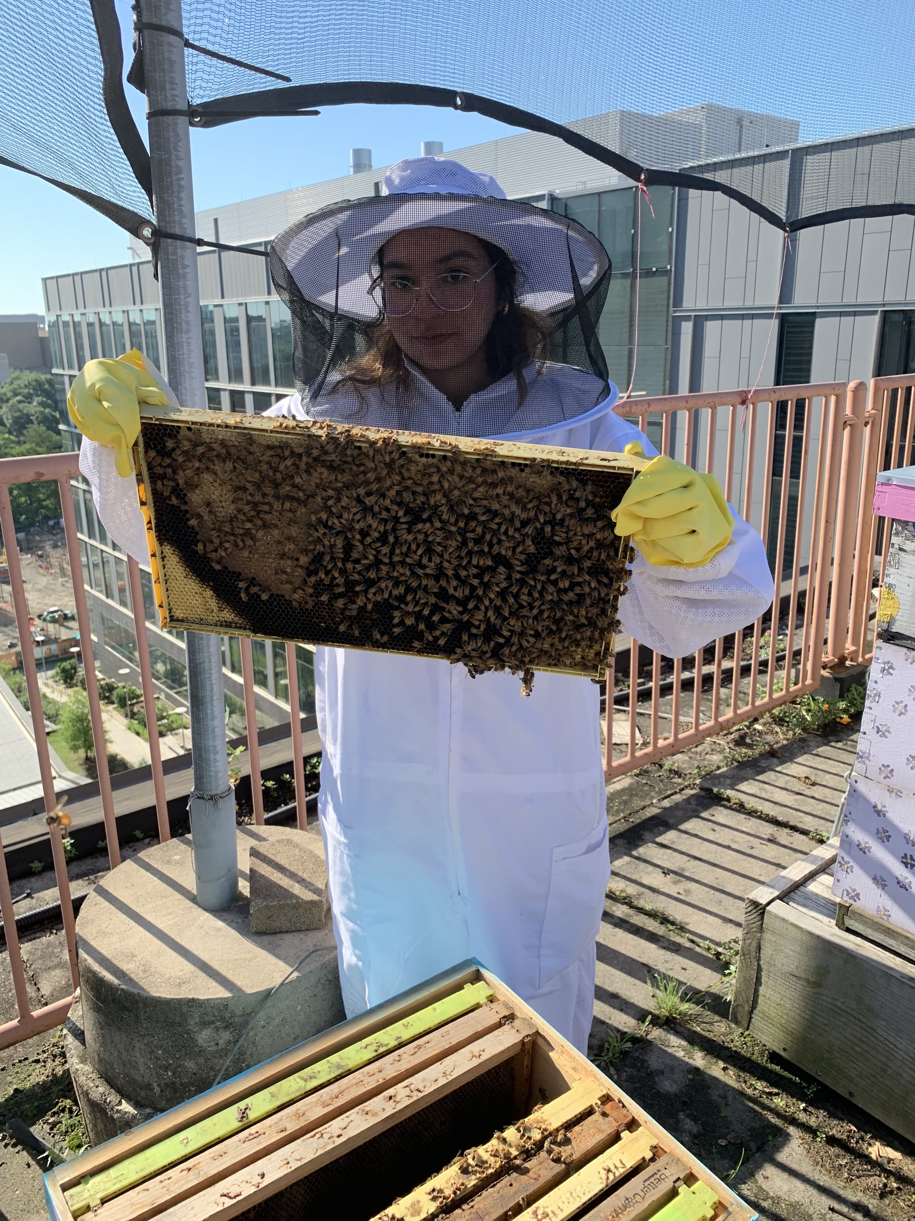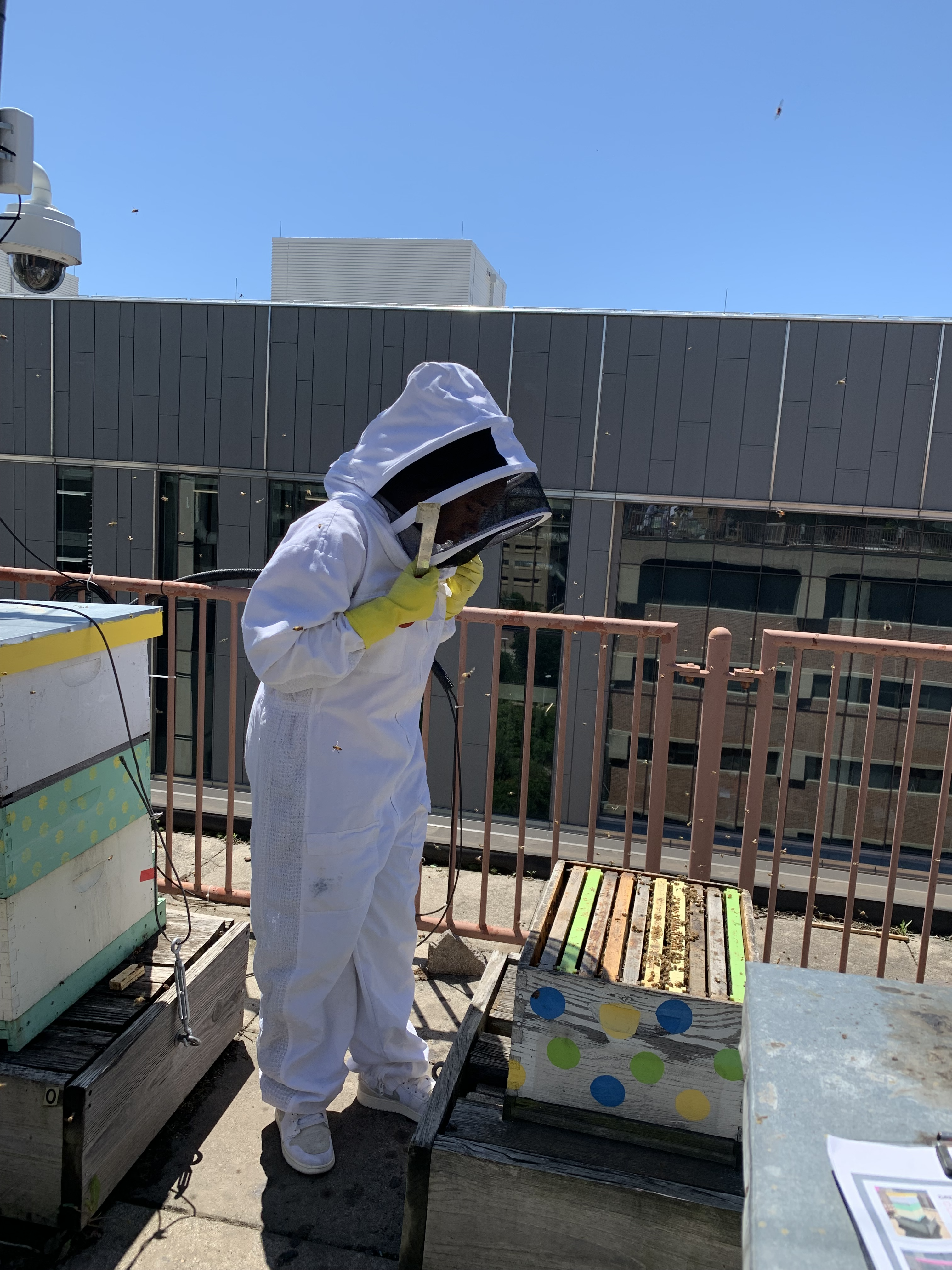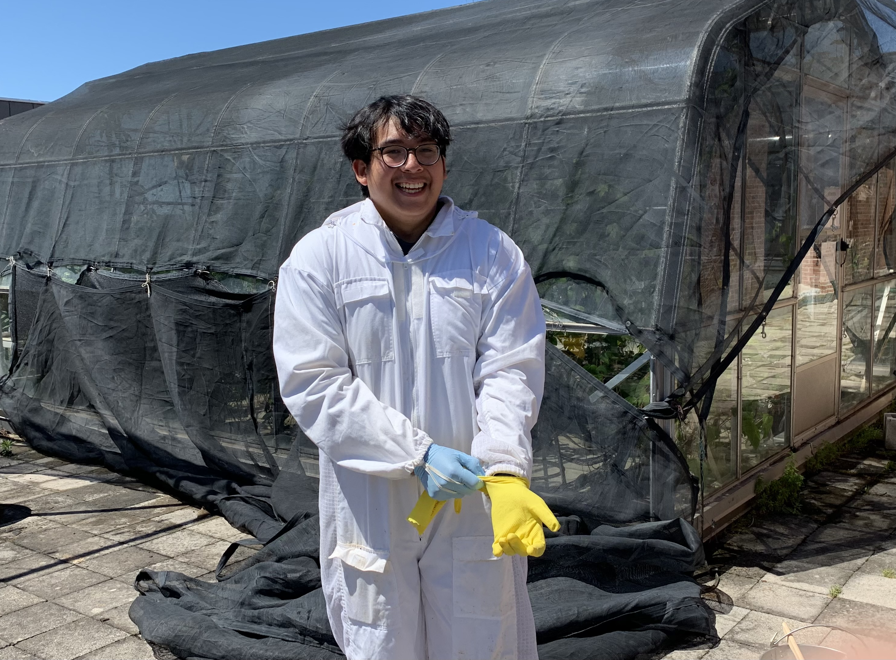 Alejandro B. dons a beesuit during hive training (April 2024) |